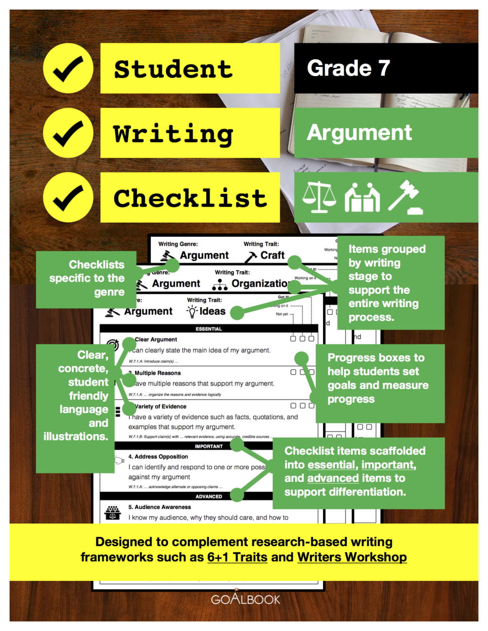 Writing checklists support students develop as independent writers by reminding them. These checklists also allow students to set their own goals and monitor progress in their own writing. Specific checklist items are scaffolded into the categories of essential, important, and advanced to support differentiation. The the checklists are divided into Ideas, Organization, and Craft so that they can support students throughout the writing process rather than simply being used at the end.